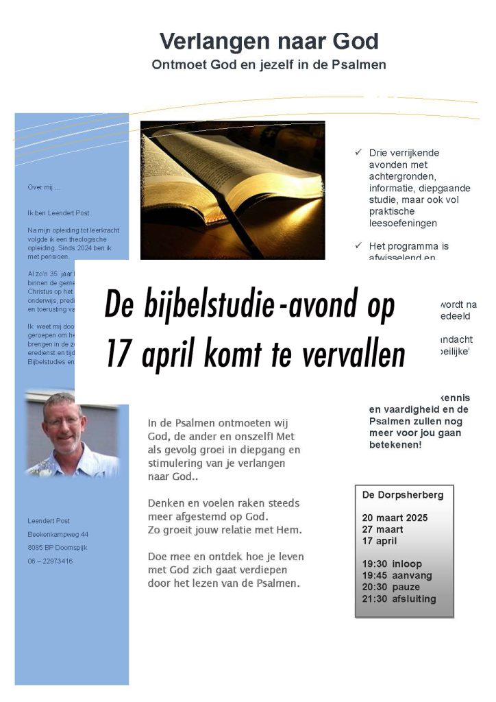 Mocht je niet in de gelegenheid zijn om naar de DorpsHerberg te komen, dan kun je kerkdienst meebeleven via Youtube of via https://kerkdienstgemist.nl/stations/1713-Vrije-Evangelische-Gemeente-Nunspeet